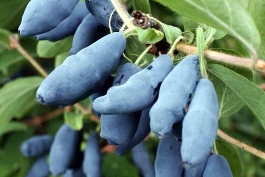 - Плоды: крупные, удлинённые, тёмно-синие ягоды с восковым налётом